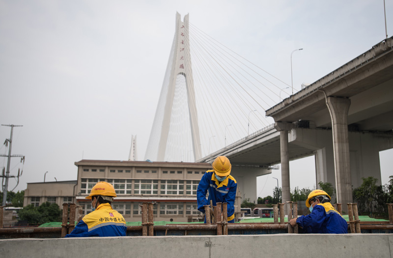 4月30日,來自中鐵七局的建設者在武漢武九北綜合管廊工程施工現場作業。新華社記者 肖藝九 攝
