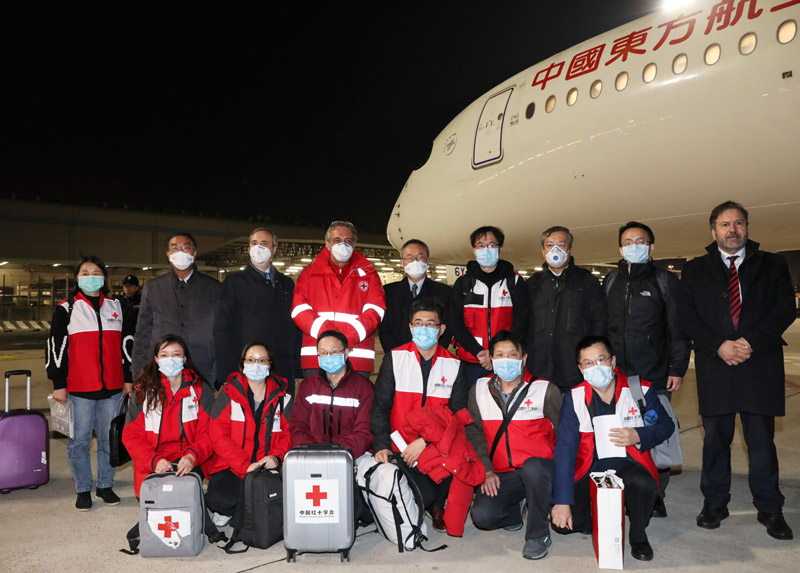 3月12日,在意大利首都羅馬,意大利紅十字會主席羅卡(后排右六)與中國抗疫醫療專家組一行9人合影。當天,由國家衛生健康委和中國紅十字會共同組建的抗疫醫療專家組一行9人抵達羅馬,并攜帶部分中方捐助的醫療物資。新華社記者 程婷婷 攝