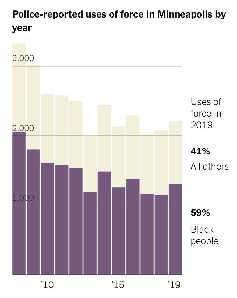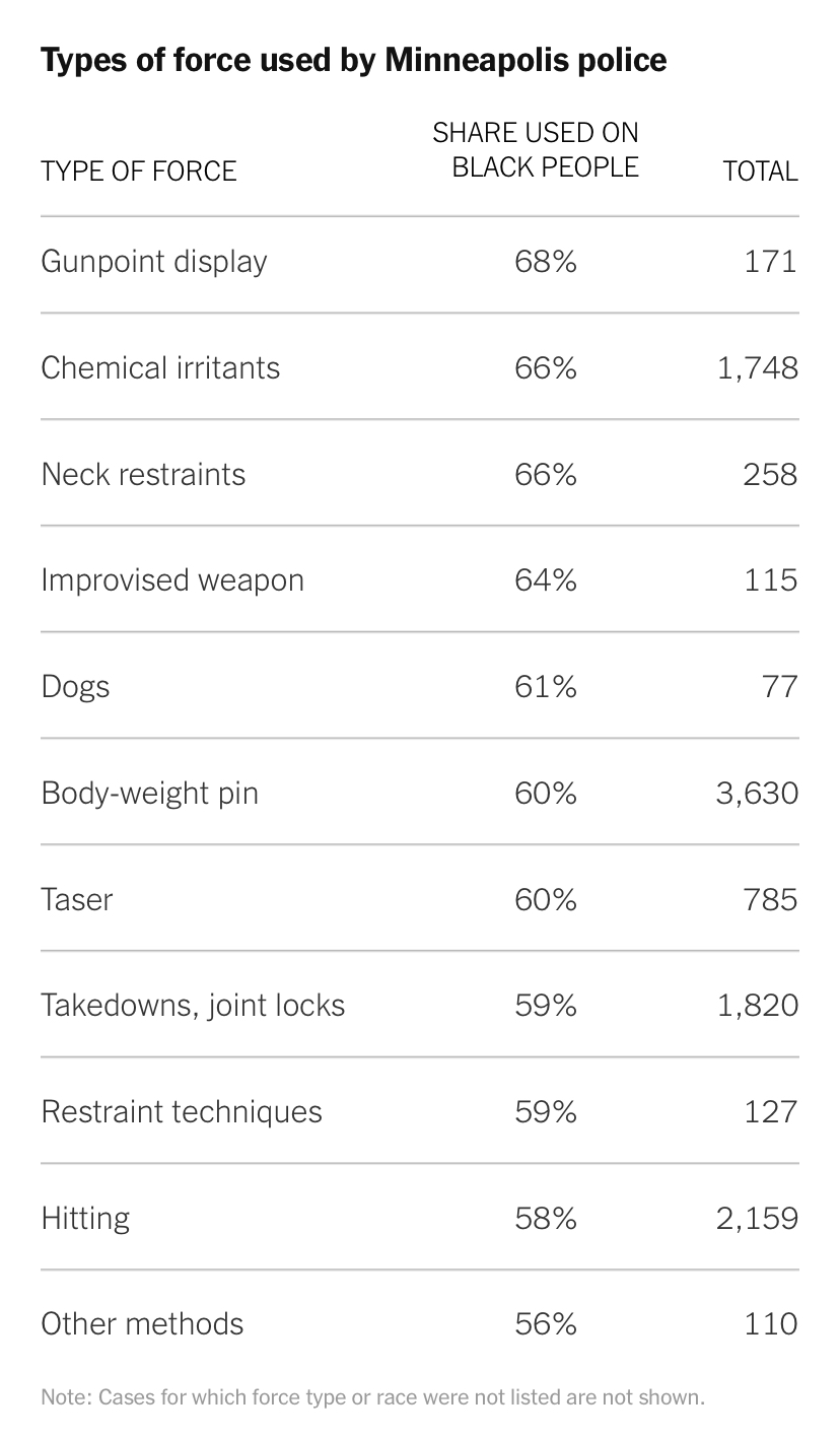 △《紐約時報》報道,在明尼阿波利斯,被警察實施武力的對象近60%為非裔