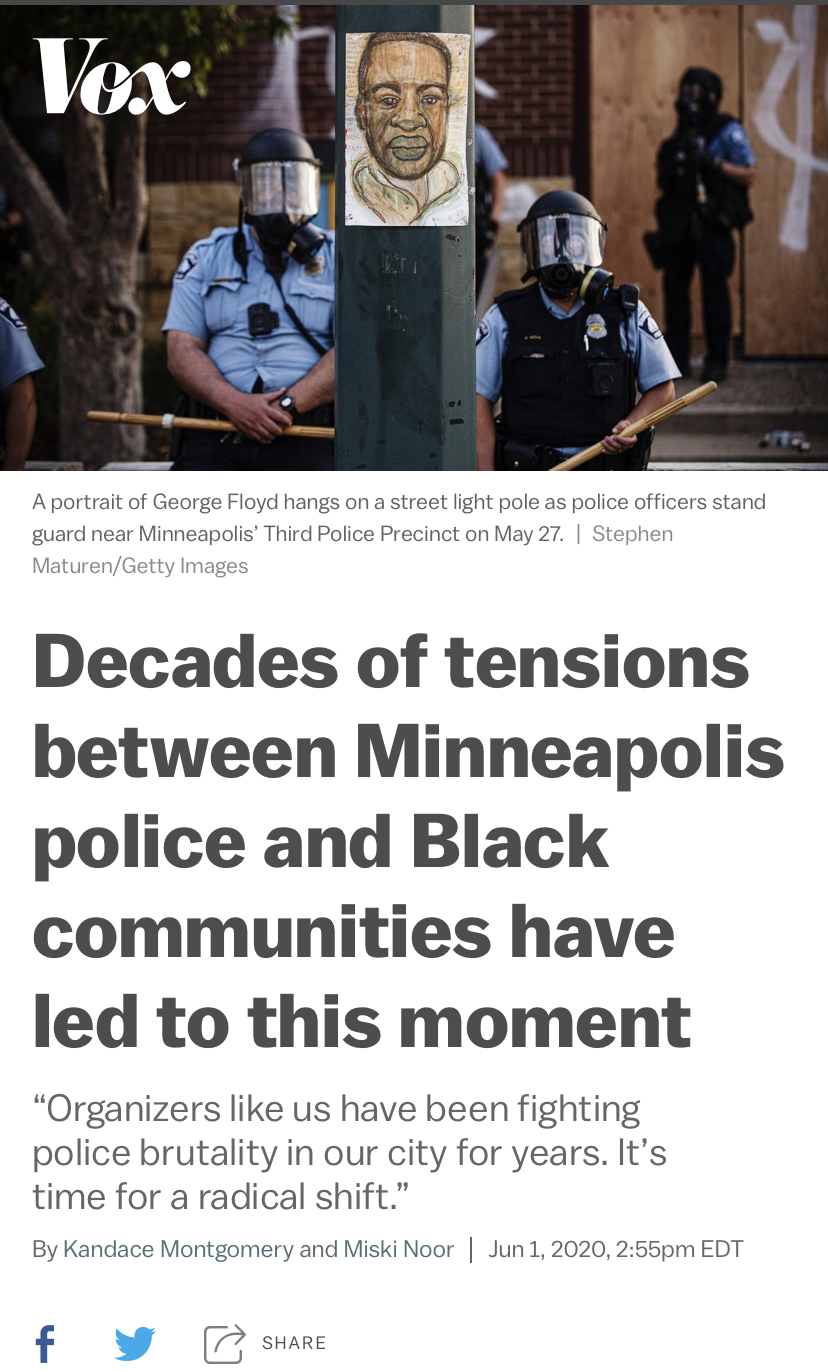 △Vox報道,多年來,明尼阿波利斯警方與非裔社區(qū)間的緊張關系導致了弗洛伊德慘劇的發(fā)生