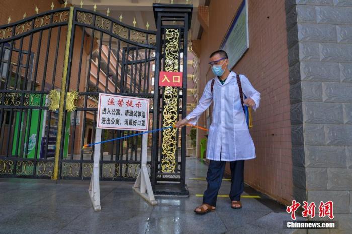 資料圖:海口經濟學院的工作人員在學生宿舍樓入口消毒。 中新社記者 駱云飛 攝