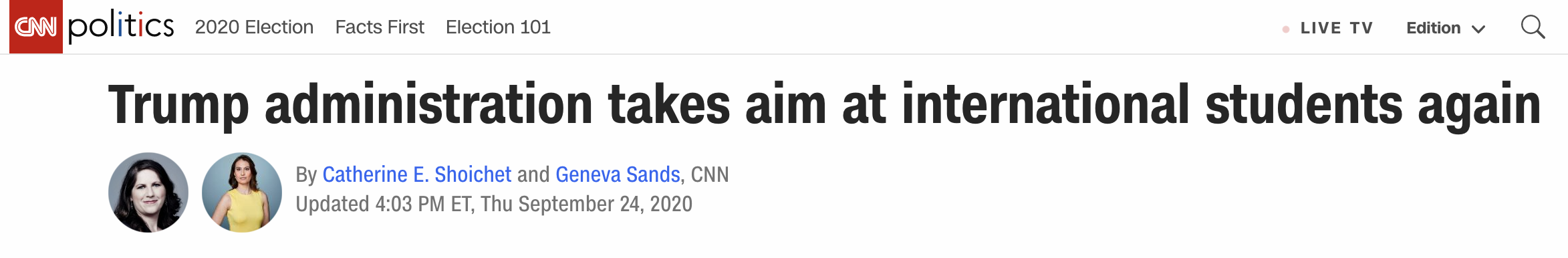 CNN報道稱,這并非特朗普政府首次拿留學生“開刀”。今年7月,美國政府曾出臺一項涉留學生簽證的新規,稱不會給在秋季學期僅上網課的留學生發放簽證,也將不允許這些學生進入美國。