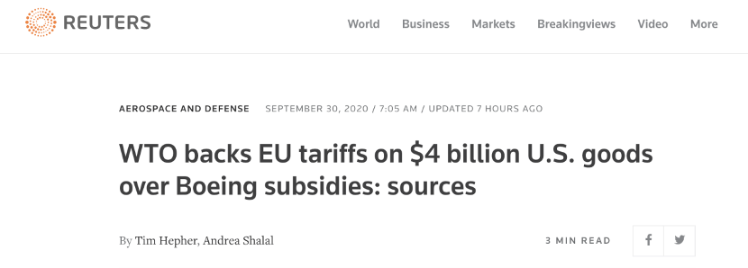 據(jù)路透社9月30日報道,消息人士稱,世界貿易組織(WTO)已準許歐盟對價值40億美元的美國商品加征關稅,作為對波音公司獲得美國補貼的反制措施。世貿組織仲裁機構將在未來幾周公布這一決定。