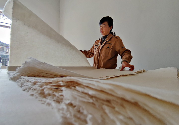據了解,運用傳統工藝制作而成的宣紙,從選材、制漿到晾曬、撈紙、剪紙等,需要大大小小108道工序,經歷風吹雨打,千錘百煉,最終才能制成一張宣紙。由于原料限制,當地正宗的宣紙年產量只有800多噸,產量很低。