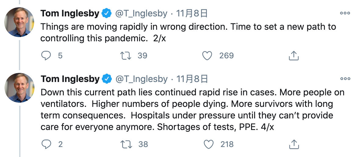 約翰斯·霍普金斯大學健康衛(wèi)生安全中心主任湯姆·英格斯比在社交媒體上發(fā)文稱:“照目前的趨勢來看,美國確診病例數(shù)將持續(xù)激增,死亡病例數(shù)也將增加。醫(yī)院將承受越來越大的壓力,直到它們超負荷運轉,無法再為病人提供治療!