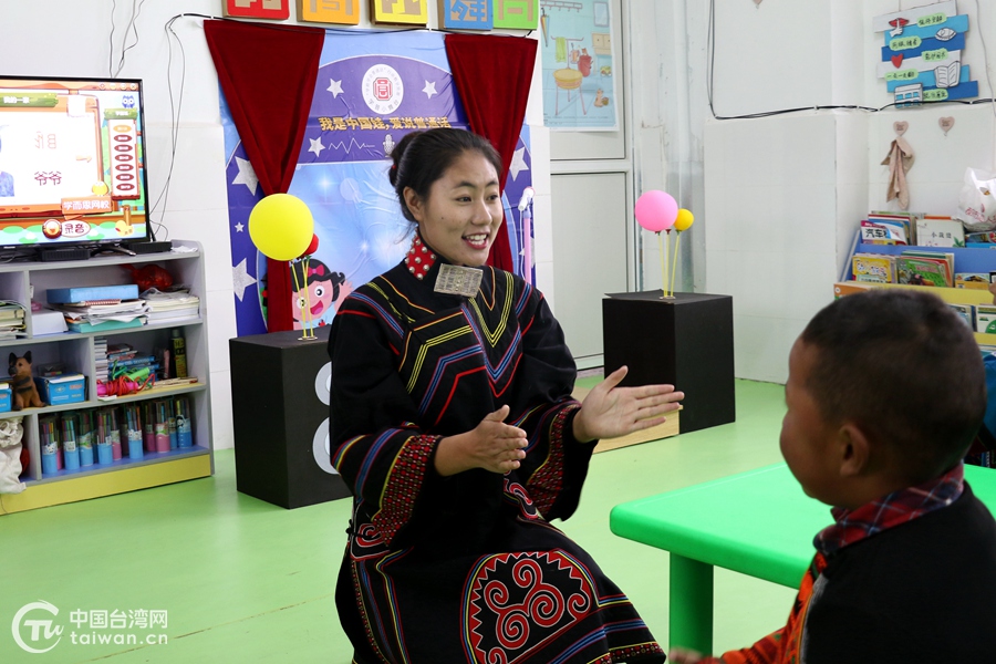 灑拉地坡鄉(xiāng)幼兒園教師羅英與孩子們互動(dòng)。(中國(guó)臺(tái)灣網(wǎng) 尹賽楠 攝)