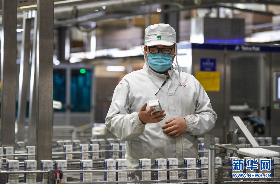 3月19日,技術人員在呼和浩特市蒙牛圣牧高科乳品有限公司的生產車間內檢查產品的包裝情況。新華社記者 彭源 攝