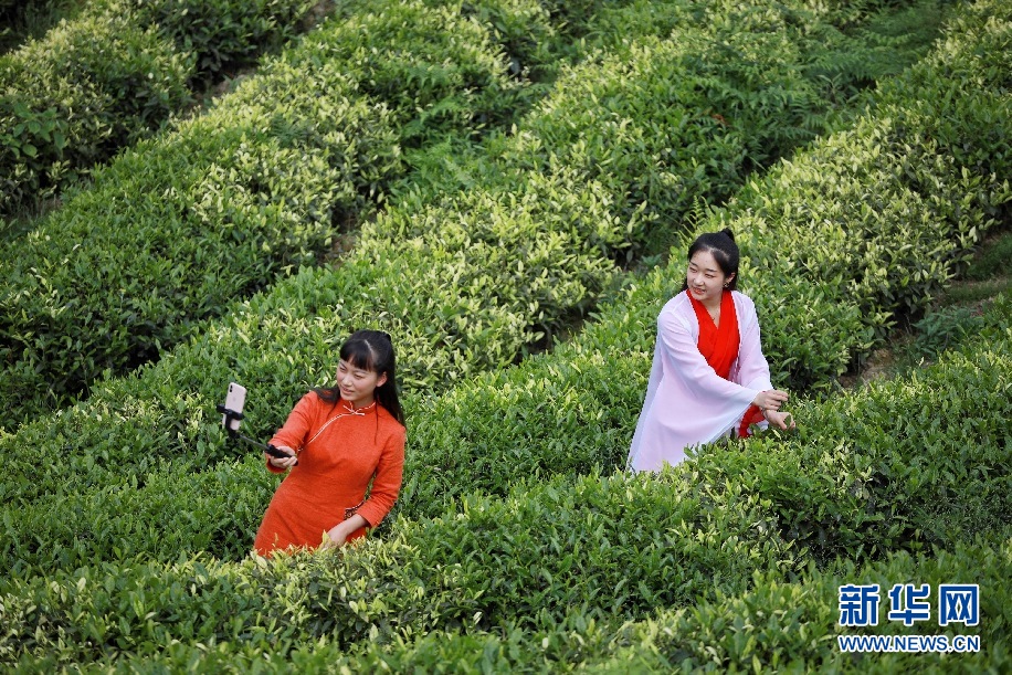 4月30日,網絡主播毛華艷(右)在貴州省余慶縣白泥鎮春景村郊外的茶園直播,助推山區茶葉銷售。新華社記者 劉續 攝