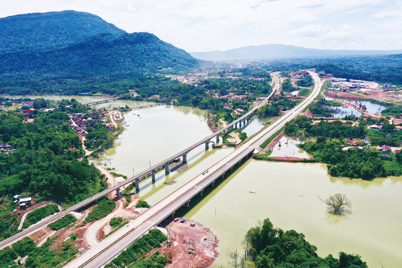 位于瀾滄江—湄公河流域的中老鐵路是中國“一帶一路”倡議與老撾“變陸鎖國為陸聯國”戰略對接項目。中老鐵路全部采用中國技術標準和管理標準建設,設計時速160公里,為電氣化客貨混運鐵路,計劃2021年12月建成通車。圖為在老撾萬象省航拍的建設中的中老鐵路(左)。 新華社發