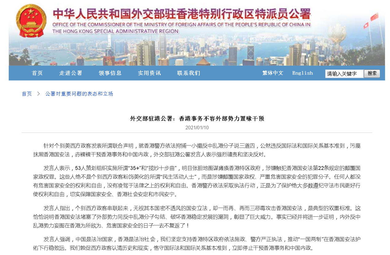 1月10日,針對(duì)個(gè)別美西方政客發(fā)表所謂聯(lián)合聲明,就香港警方依法拘捕一小撮反中亂港分子說(shuō)三道四,公然違反國(guó)際法和國(guó)際關(guān)系基本準(zhǔn)則,污蔑抹黑香港國(guó)安法,赤裸裸干預(yù)香港事務(wù)和中國(guó)內(nèi)政,外交部駐港公署發(fā)言人表示強(qiáng)烈譴責(zé)和堅(jiān)決反對(duì)。
