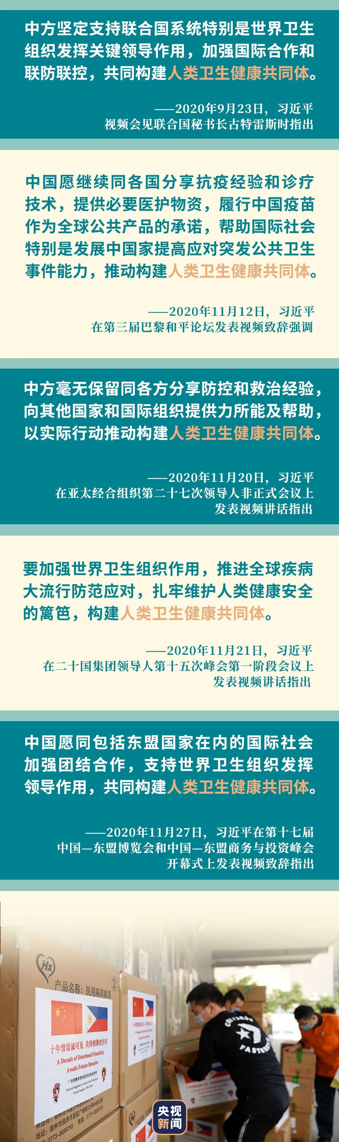 2020年3月,中國疫情防控的關鍵時刻,習近平主席向法國總統馬克龍致慰問電時首次提出“打造人類衛生健康共同體”的理念。2020年4月2日,在同印度尼西亞總統佐科通電話時,習近平重申:“中國將秉持人類命運共同體理念,為全球疫情防控分享經驗,提供力所能及的支持,同各國一道促進全球公共衛生事業發展,構建人類衛生健康共同體!