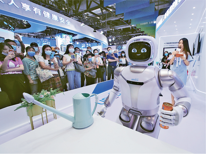 2020年中國國際服務貿(mào)易交易會于9月4日至9日在北京舉行。這場盛會的舉行,展現(xiàn)了中國應對疫情的成效、經(jīng)濟復蘇的溫度,更彰顯了持續(xù)深化改革、以開放促合作的誠意和決心。圖為9月9日,參觀者在服貿(mào)會觀看智能家居機器人的表演。 人民圖片 杜建坡/攝