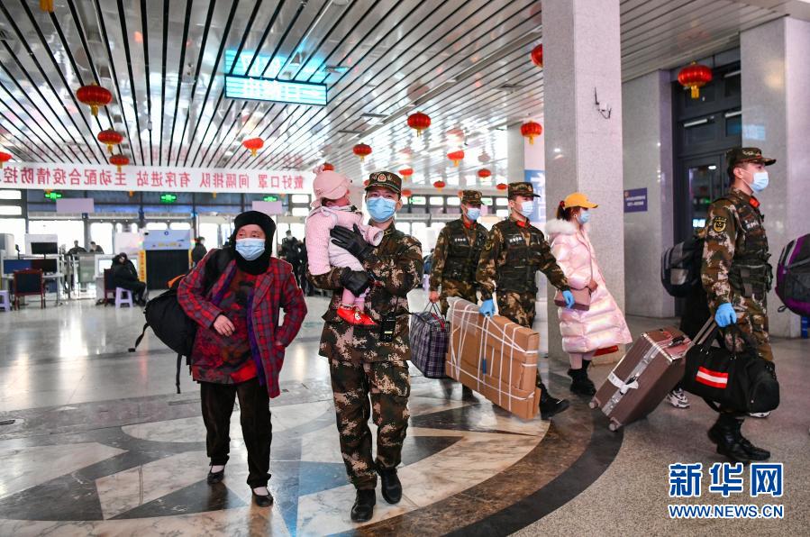 1月28日,武警甘肅總隊蘭州支隊執勤官兵在蘭州火車站幫助旅客進站。