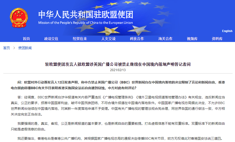 中國駐歐盟使團發言人就歐盟涉英國廣播公司被禁止繼續在中國境內落地聲明答記者問