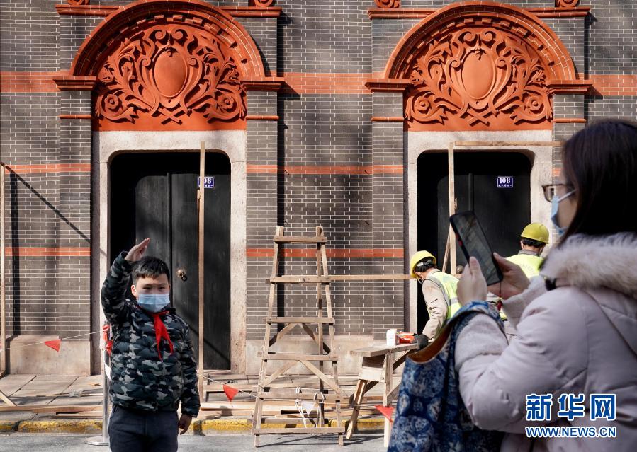 2月4日,上海市民林女士在修繕中的中共一大會(huì)址前為小學(xué)三年級(jí)的兒子拍照。新華社記者 劉穎 攝