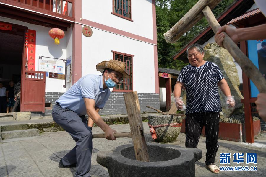 游客在江西省井岡山市神山村村民左秀發(fā)家體驗(yàn)手打糍粑(2020年7月15日攝)。新華社記者 彭昭之 攝