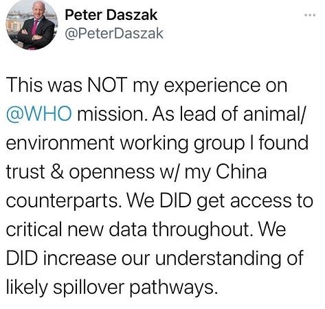 世界衛(wèi)生組織病原體顧問、美國非營利組織生態(tài)健康聯(lián)盟(EcoHealth Alliance)主席彼得·達扎克(Peter Daszak)在推特上表示:“這不是我在世界衛(wèi)生組織的任務中得到的經驗,作為動物和環(huán)境工作組的負責人,我感到中國同行們坦率并值得信任。我們(在調查中)得到了重要的新數據,我們也了解了更多關于病毒傳播途徑的信息。”