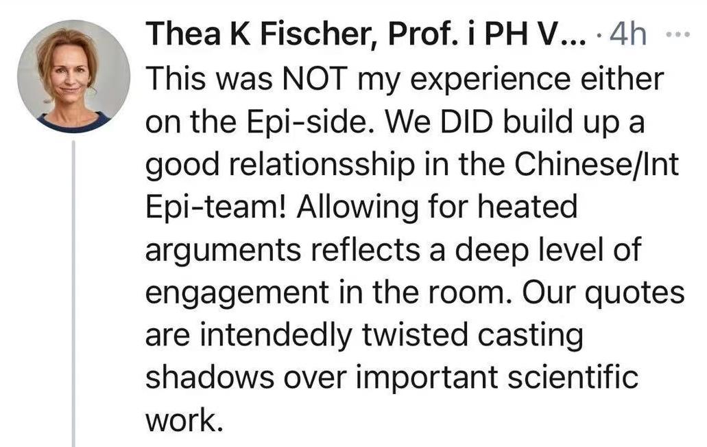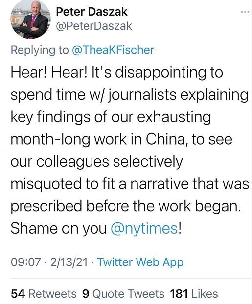 世界衛(wèi)生組織麻疹、風疹、流感和小兒麻痹癥參考實驗室負責人、公共衛(wèi)生專家西婭·菲舍爾(Thea K Fischer)也在推特上發(fā)帖表示《紐約時報》的報道嚴重扭曲了她所說的話:“這也不是我在流行病學團隊得到的經驗。中國方面和國際流行病學團隊建立了良好的關系,(我們)進行的熱烈討論也反應了(中國方面的)高度參與。我們說的話被嚴重扭曲,這為重要的科學工作帶來了陰影。”