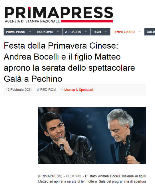 意大利重要的全國性報紙之一《日報》在網(wǎng)站發(fā)表題為《波切利父子春晚獻唱賀新春》的文章。文章寫道,中央廣播電視總臺春節(jié)聯(lián)歡晚會以歌舞、小品等形式,將建黨百年、疫情防控等主題生動呈現(xiàn)。意大利歌唱家波切利父子在晚會中演唱《我的太陽》等歌曲。意大利網(wǎng)友在社交媒體紛紛留言,表示愿中意兩國人民友誼長存。意大利最大的電視臺及新聞網(wǎng)站Tgcom24、意大利Teleambiente電視臺在晚間資訊欄目、意大利全國性通訊社Primapress分別發(fā)表了相關(guān)報道。