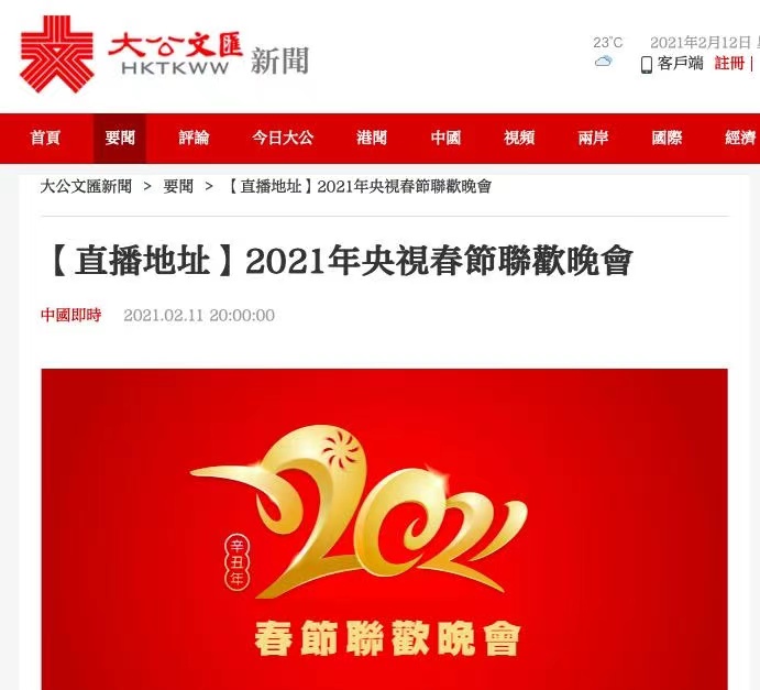 香港電視廣播有限公司(TVB)全程直播了春晚,大公文匯、《香港商報》、橙新聞也在新媒體平臺上進行網(wǎng)絡(luò)在線直播或摘播,吸引大量觀眾實時收看,并引起強烈反響。澳門廣播電視公司及旗下新媒體平臺澳廣視網(wǎng)站對春晚進行了轉(zhuǎn)播。
