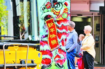 2月6日,在新西蘭惠靈頓市中心的商業街上,行人從中國藝術燈箱展中的一處裝置旁走過。 新華社發