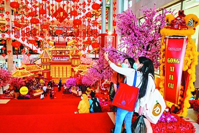 在馬來西亞吉隆坡一家商場,人們戴著口罩在春節裝飾品旁拍照。 新華社發