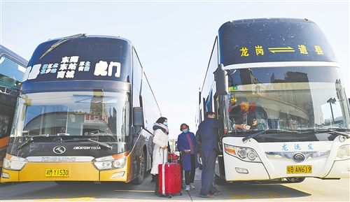 2月17日,湖南省永州市道縣汽車北站,旅客準備上車。當日,永州市迎來務工返程小高峰。該縣各車站“保運”“防控”兩手抓、兩不誤,為返程人員提供交通運輸保障。 何紅福攝
