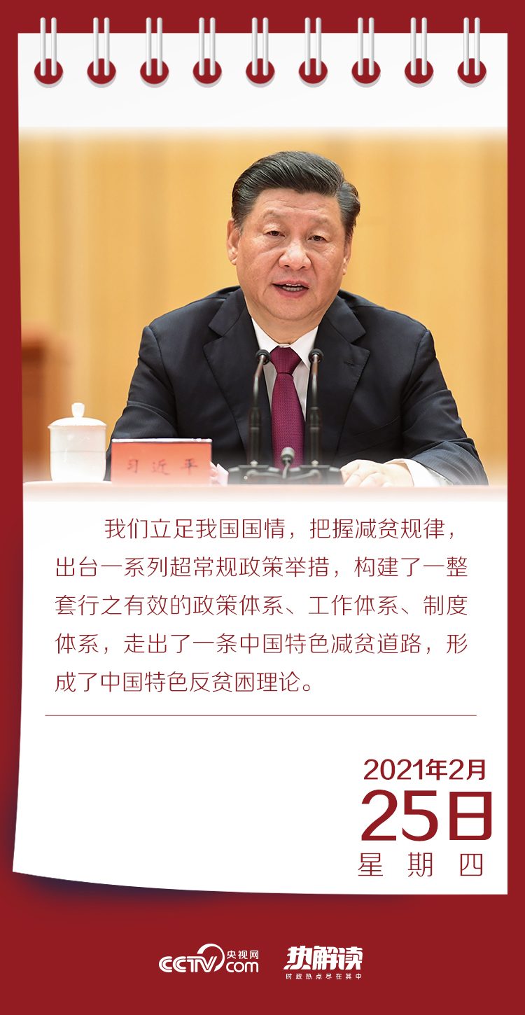 “我們立足我國國情,把握減貧規律,出臺一系列超常規政策舉措,構建了一整套行之有效的政策體系、工作體系、制度體系,走出了一條中國特色減貧道路,形成了中國特色反貧困理論。”