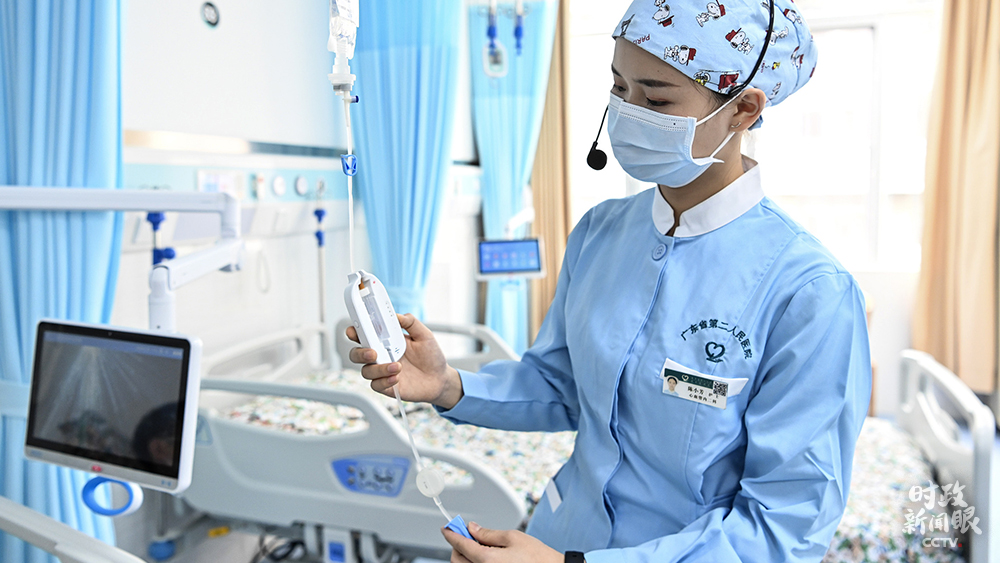 △廣東省第二人民醫(yī)院工作人員在5G智慧病房內(nèi)演示“智能輸液監(jiān)測器”的功能。