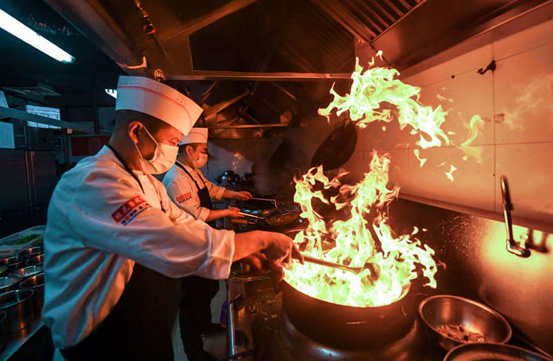 2月1日,在石家莊市橋西區一家餐廳,廚師在后廚佩戴口罩炒菜。新華社記者 王曉 攝