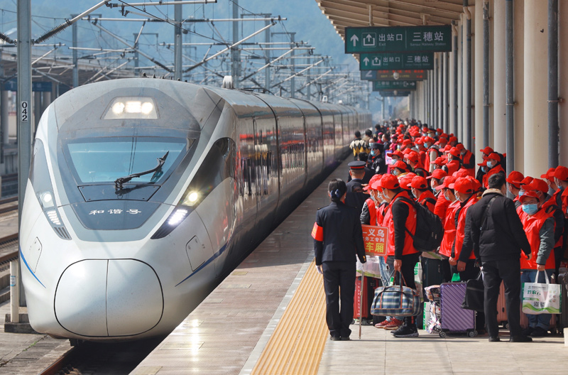 2月20日,務工人員在三穗站準備登上動車。當日,500余名貴州省黔東南苗族侗族自治州錦屏縣務工人員在三穗站搭乘2021年貴州首趟務工專列G2336次列車前往浙江義烏。新華社記者 劉續 攝