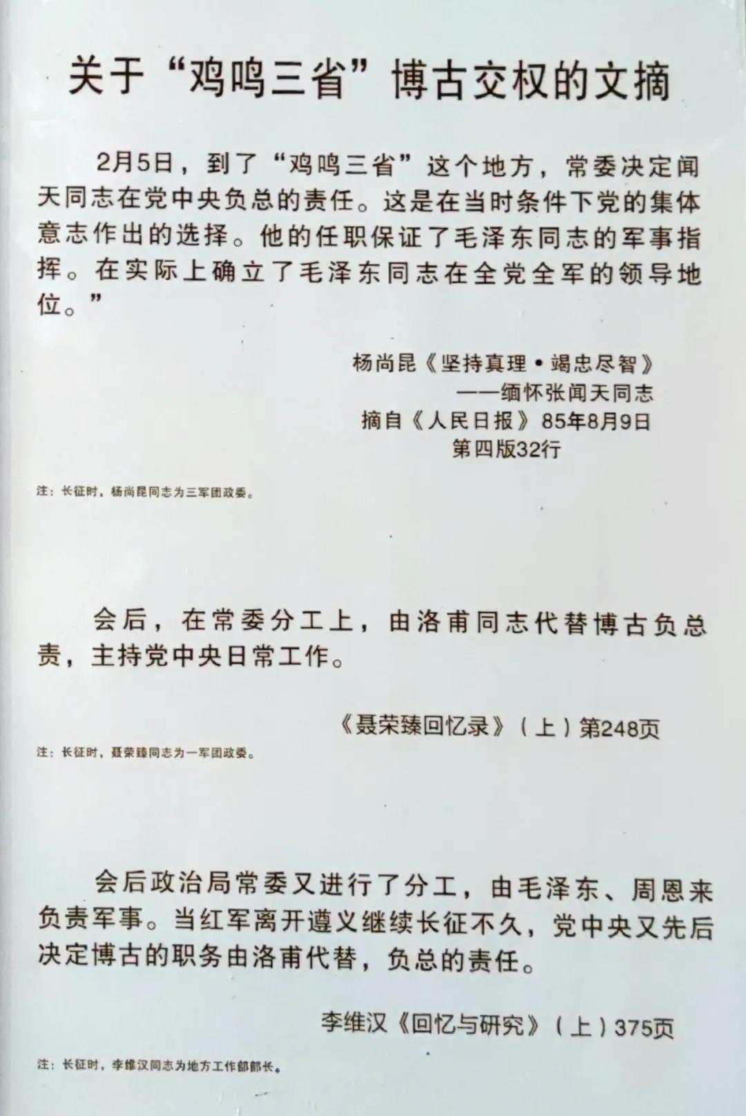 “洛甫那個時候提出要變換領導,他說博古不行。我記得很清楚,毛主席把我找去說,洛甫現在要變換領導。我們當時說,當然是毛主席,聽毛主席的話。毛主席說,不對,應該讓洛甫做一個時期。……說服了大家,當時就讓洛甫做了。”