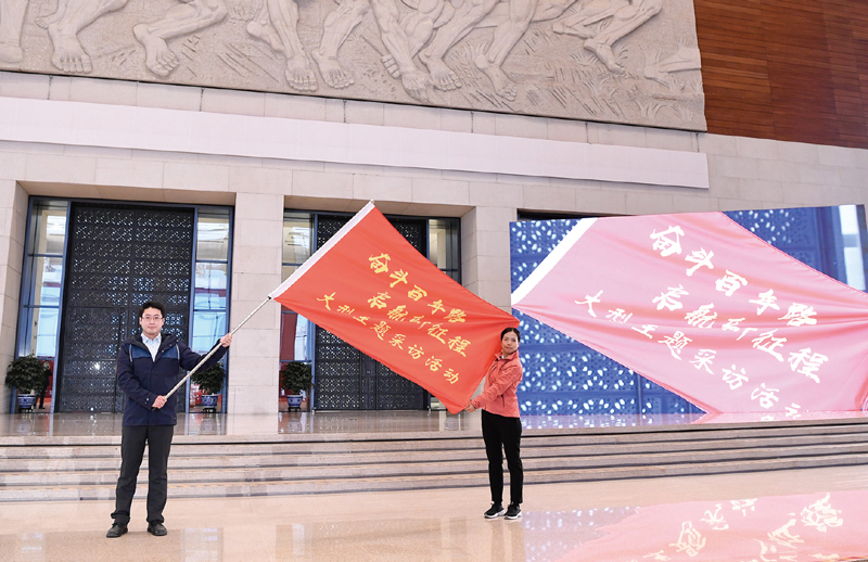 2021年1月18日,中宣部在國家博物館舉行“奮斗百年路 啟航新征程”大型主題采訪活動(dòng)啟動(dòng)儀式。中央和地方主要媒體的編輯記者代表在北京主會(huì)場和各省區(qū)市分會(huì)場參加啟動(dòng)儀式。圖為記者代表展示“奮斗百年路 啟航新征程”大型主題采訪活動(dòng)旗幟。 新華社記者 申宏/攝