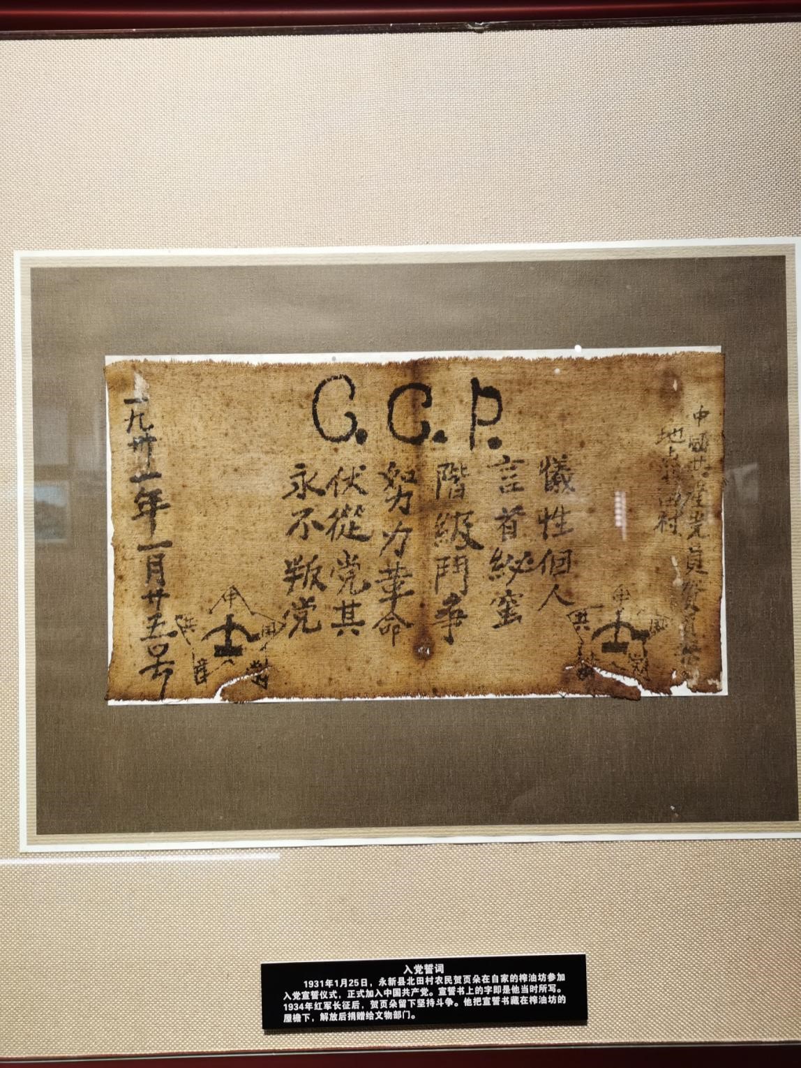 這份入黨誓詞,正是普通農(nóng)民在爭取翻身解放的艱難歷程中堅定跟黨走的歷史見證。原件現(xiàn)收藏于中國國家博物館,復制品在井岡山博物館展出。