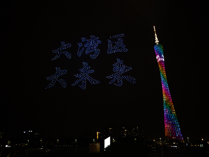 4月19日晚,廣州海心沙的無人機(jī)天幕光影表演。圖為1000架無人機(jī)組成“大灣區(qū)大未來”文字圖案。人民日報記者 張武軍攝