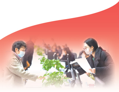 2021年2月18日,在湖北省荊州市政務服務中心,工作人員在為群眾辦理事項。