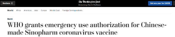 英國廣播公司(BBC)報道稱,世界衛(wèi)生組織周五表示,它已驗證了國藥疫苗的“安全性、有效性和質(zhì)量”。這是第一款得到世衛(wèi)組織支持的非西方國家研制的新冠疫苗。中國和其他一些國家已經(jīng)有數(shù)千萬人接種了國藥疫苗。