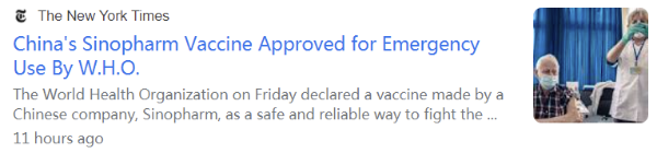 英國路透社報道認為,世界衛(wèi)生組織周五批準中國國有制藥企業(yè)國藥集團生產(chǎn)的新型冠狀病毒疫苗可用于緊急使用,這將推動中國在全球新冠疫苗接種方面發(fā)揮重要作用。