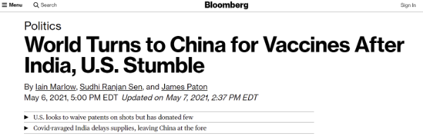 另據(jù)美國彭博社5月6日報道稱,世界上缺少新冠疫苗的國家越來越傾向向中國尋求幫助,盡管美國一直試圖強調(diào)自己的疫苗供應能力。