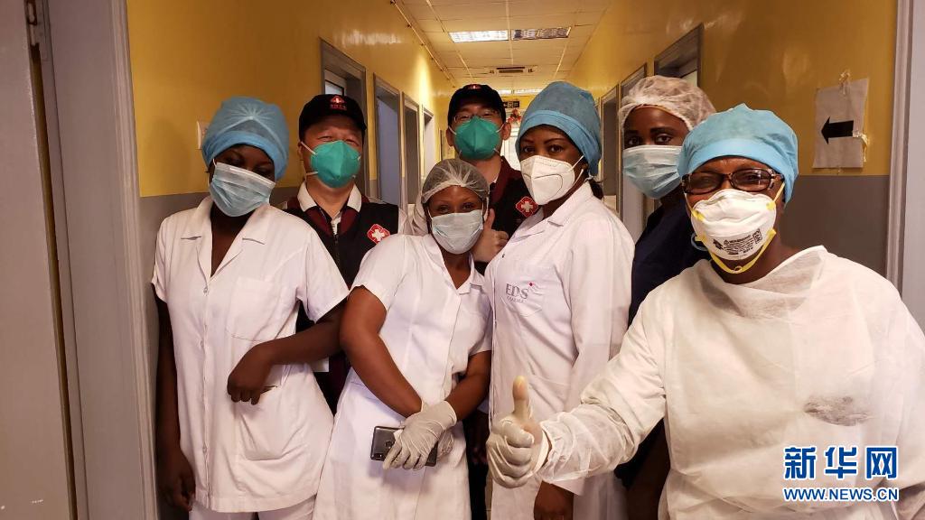 2020年5月26日,中國抗疫醫療專家組在剛果(布)首都布拉柴維爾指導新冠肺炎病房建設時,與當地一線醫務人員合影。新華社發
