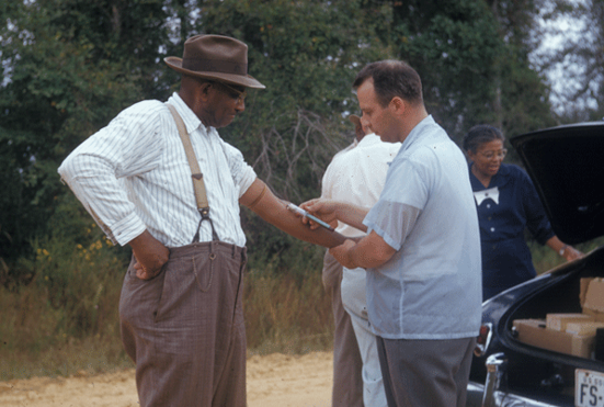 △塔斯基吉實(shí)驗(yàn),工作人員給實(shí)驗(yàn)對(duì)象抽血。圖片來(lái)源:美國(guó)疾病控制與預(yù)防中心