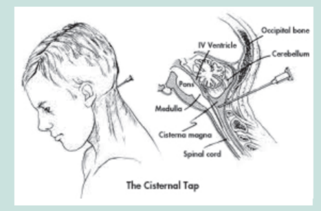 △研究員利用多種手段感染實(shí)驗(yàn)對(duì)象。包括圖中表現(xiàn)的小腦延髓池穿刺。根據(jù)危地馬拉梅毒研究項(xiàng)目的主任卡特勒所說(shuō),這樣做是為了研究人體血-腦脊髓液屏障的有效性。圖片來(lái)源:美國(guó)總統(tǒng)生物倫理研究委員會(huì)2011年9月報(bào)告