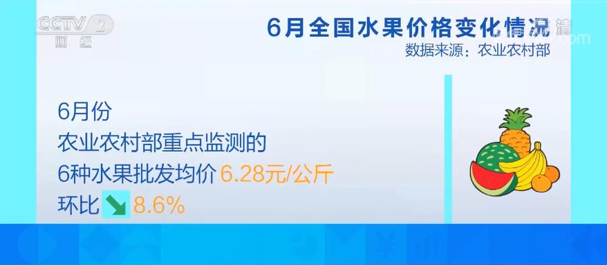 數據顯示,6月份農業農村部重點監測的6種水果批發均價每公斤6.28元,環比下降8.6%。
