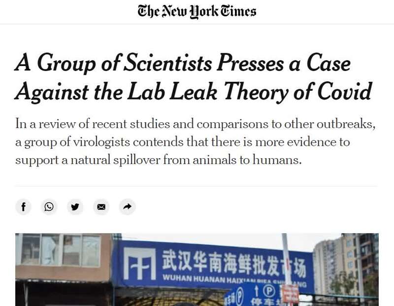 柯文思提到的這篇報道,題為“多名科學家反駁(新冠病毒)實驗室泄漏論”(A Group of Scientists Presses a Case Against the Lab Leak Theory of Covid),由《紐約時報》專欄作者卡爾·齊默和科普作者詹姆斯·戈曼共同撰寫。該報道在紐約時報網站上首發于7月9日,7月22日有內容更新。報道援引21名權威病毒學家最新發表的一份聯名報告說,最可能導致新冠病毒大流行的原因,是從動物到人類的“自然溢出”,而不是所謂“實驗室泄漏”。由于“新冠病毒源于自然”的證據越來越多,就連以前對此持懷疑態度的科學家也開始“倒戈”,明確反對某些西方政客制造的“陰謀論”。
