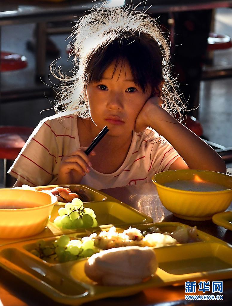 7月29日,一名小朋友在鶴壁市浚縣黎陽(yáng)中學(xué)長(zhǎng)豐校區(qū)安置點(diǎn)內(nèi)吃晚飯。