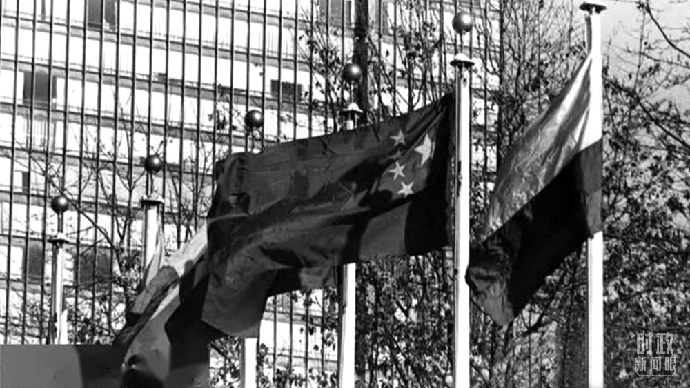 △新中國恢復(fù)聯(lián)合國合法席位后,五星紅旗飄揚(yáng)在聯(lián)合國大廈前的廣場上。(資料圖)