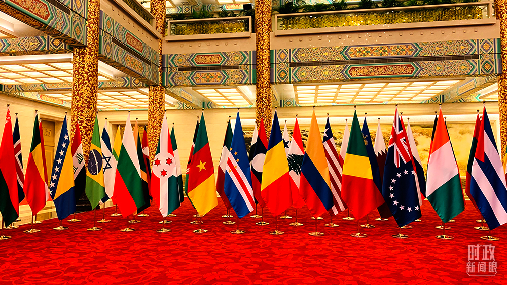 △紀(jì)念會議現(xiàn)場,聯(lián)合國各會員國國旗組成的旗陣。(總臺央視記者范一鳴拍攝)