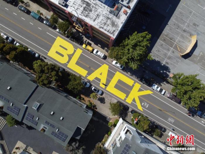 資料圖:當?shù)貢r間2020年6月13日,美國舊金山市政廳附近的街面上,出現(xiàn)用黃油漆涂寫的巨幅“Black Lives Matter”(黑人的命也是命)字樣。 中新社記者 劉關(guān)關(guān) 攝
