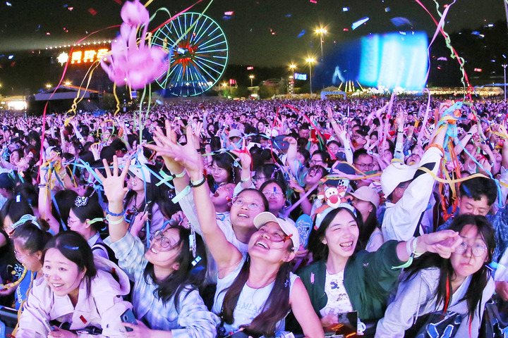 2025年5月1日晚,人們在江蘇常州太湖灣音樂節上歡呼。新華社發(陳暐攝)