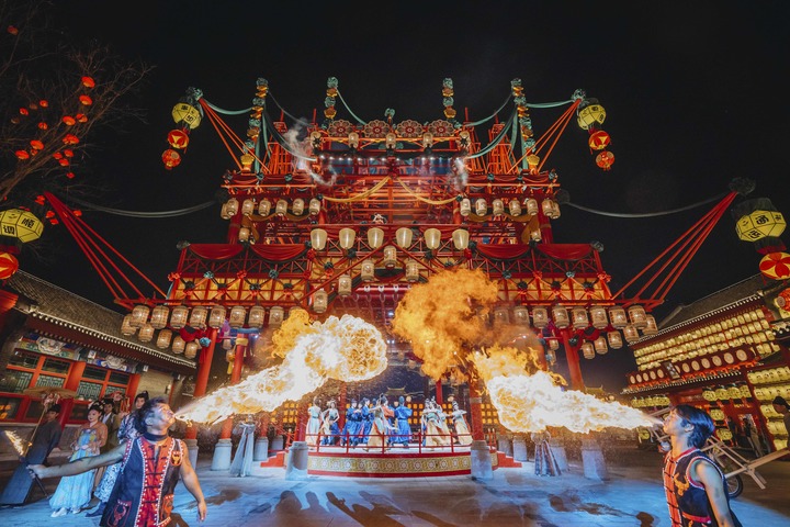 2025年6月2日晚,演員在河北省唐山市豐南區河頭老街景區為游客演出。新華社發(劉滿倉攝)